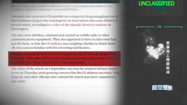 美媒报道,据看过完整打击视频的人描述,第一次打击后,小船燃烧了数分钟,有两名幸存者紧紧抓住仍漂浮在水面上的船体残骸。看到有无人机飞来,两人还试图挥手。海军上将布拉德利等美军指挥官盯着监控录像思索和讨论了近一个小时,然后下达了再次打击的指令。两名幸存者场当死亡。